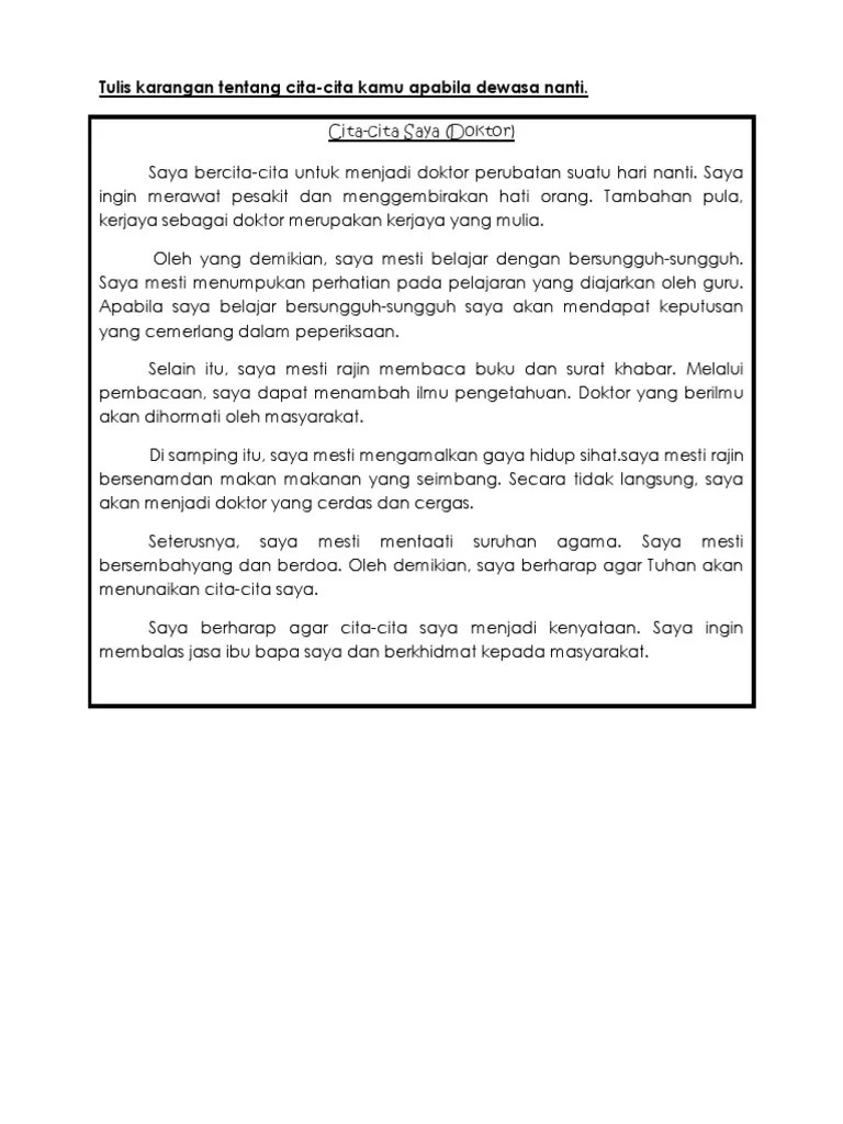 Contoh karangan cita cita saya . Cita citaku ingin menjadi dokter gigi. Saya ingin menjadi seorang juruterbang. Saya berminat untuk menjadi juruterbang kerana pekerjaan ini membolehkan saya mengembara ke . Saya ingin menjadi seorang juruterbang.